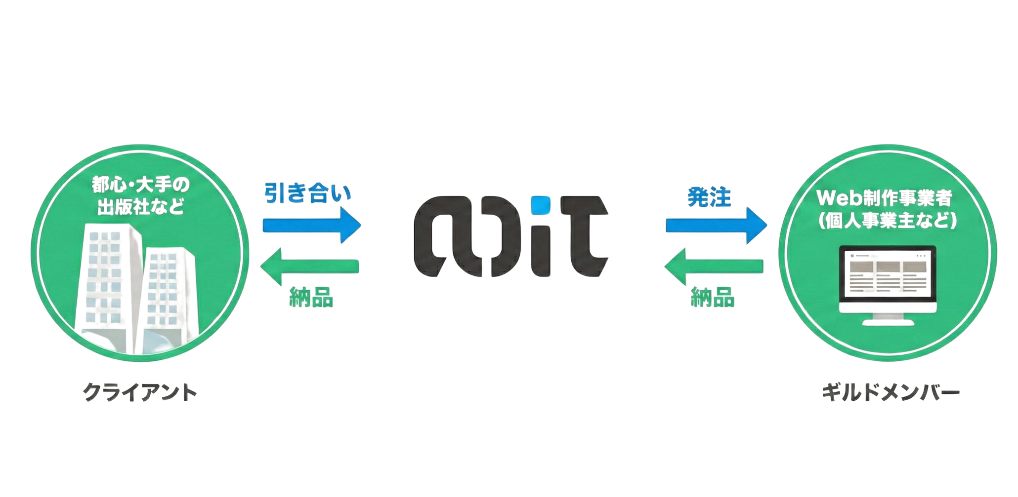 個人事業主ひとりではうけられない案件を、法人格を持つAOITで一旦うけ、ギルドメンバーに割り振っていきます。